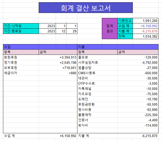 2023년도 전체 회계 결산 내역을 다음과 같이 알려드립니다.