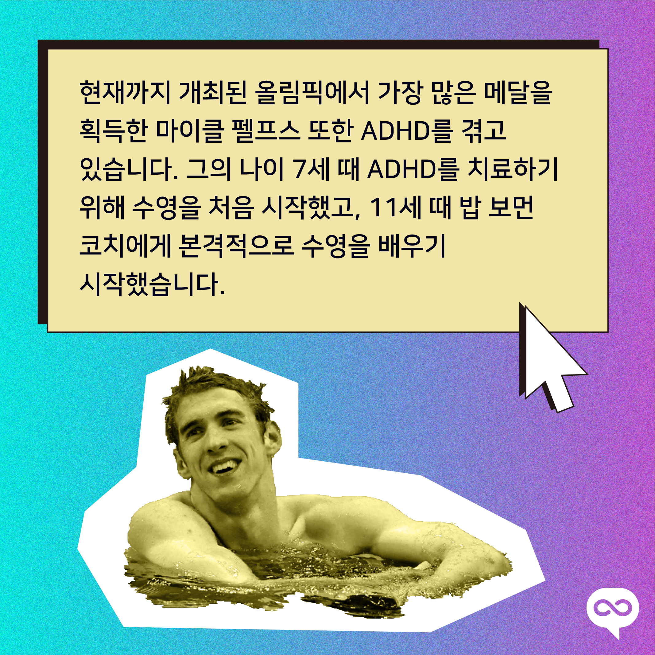 현재까지 개최된 올림픽에서 가장 많은 메달을 획득한 마이클 펠프스 또한 ADHD를 겪고 있습니다. 그의 나이 7세 때 ADHD를 치료하기 위해 수영을 처음 시작했고, 11세 때 밥 보먼 코치에게 본격적으로 수영을 배우기 시작했습니다.