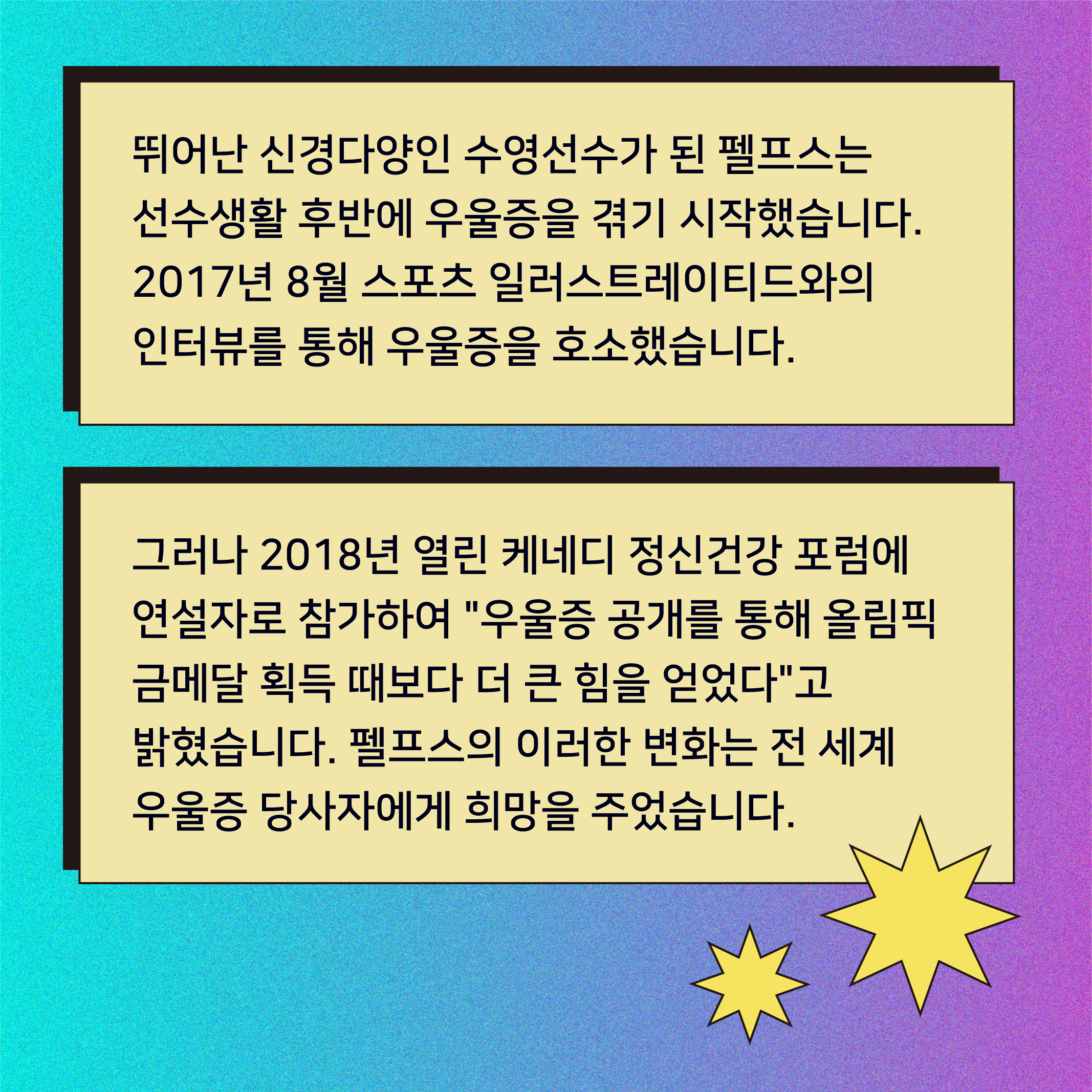 뛰어난 신경다양인 수영선수가 된 펠프스는 선수생활 후반에 우울증을 겪기 시작했습니다. 2017년 8월 스포츠 일러스트레이티드와의 인터뷰를 통해 우울증을 호소했습니다. 그러나 2018년 열린 케네디 정신건강 포럼에 연설자로 참가하여 "우울증 공개를 통해 올림픽 금메달 획득 때보다 더 큰 힘을 얻었다"고 밝혔습니다. 펠프스의 이러한 변화는 전 세계 우울증 당사자에게 희망을 주었습니다.