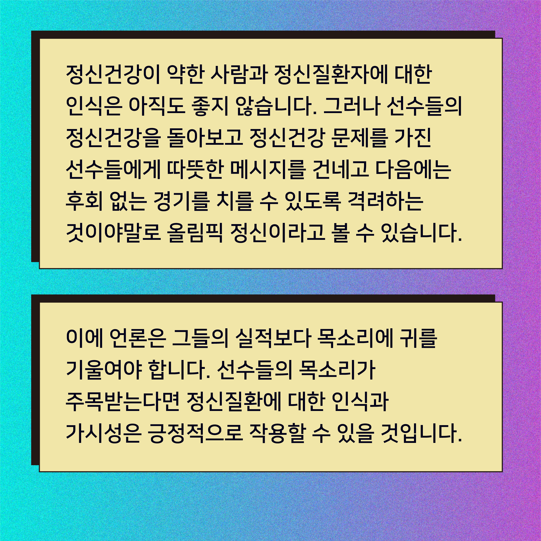 정신건강이 약한 사람과 정신질환자에 대한 인식은 아직도 좋지 않습니다. 그러나 선수들의 정신건강을 돌아보고 정신건강 문제를 가진 선수들에게 따뜻한 메시지를 건네고 다음에는 후회 없는 경기를 치를 수 있도록 격려하는 것이야말로 올림픽 정신이라고 볼 수 있습니다. 이에 언론은 그들의 실적보다 목소리에 귀를 기울여야 합니다. 선수들의 목소리가 주목받는다면 정신질환에 대한 인식과 가시성은 긍정적으로 작용할 수 있을 것입니다.