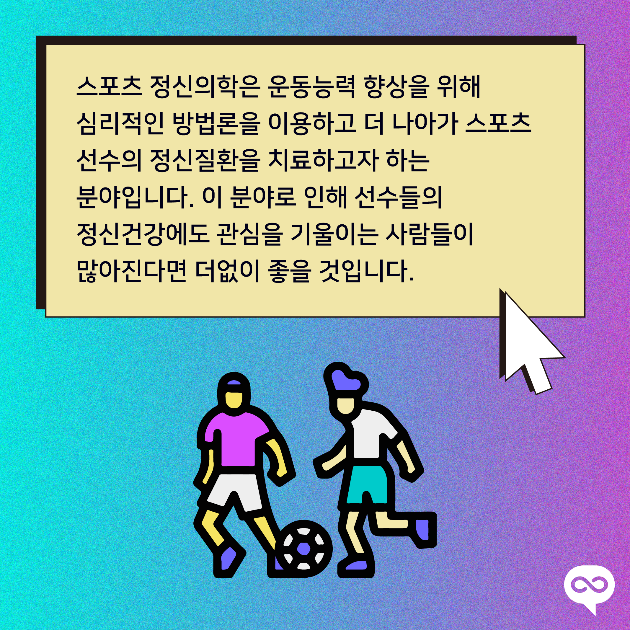 스포츠 정신의학은 운동능력 향상을 위해 심리적인 방법론을 이용하고 더 나아가 스포츠 선수의 정신질환을 치료하고자 하는 분야입니다. 이 분야로 인해 선수들의 정신건강에도 관시을 기울이는 사람들이 많아진다면 더없이 좋을 것입니다.