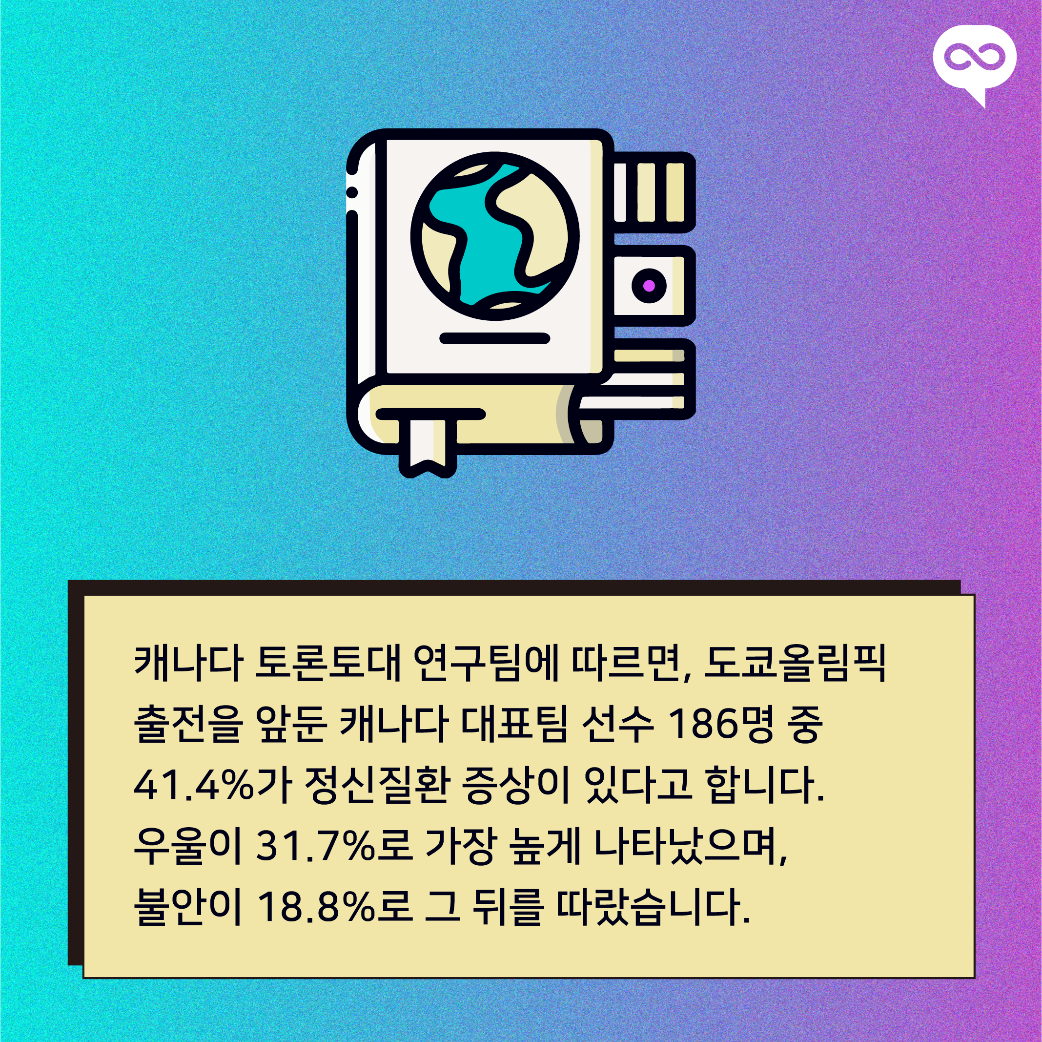 캐나다 토론토대 연구팀에 따르면, 도쿄올림픽 출전을 앞둔 캐나다 대표팀 선수 186명 중 41.4%가 정신질환 증상이 있다고 합니다. 우울이 31.7%로 가장 높게 나타났으며, 불안이 18.8%로 그 뒤를 따랐습니다.