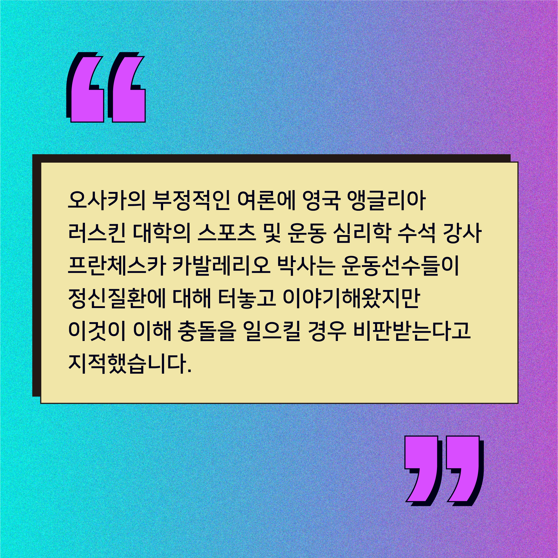 오사카의 부정적인 여론에 영국 앵그리아 러스킨 대학의 스포츠 및 운동 심리학 수석 강사 프란체스카 카발레리오 박사는 운동선수들이 정신질환에 대해 터놓고 이야기해왔지만 이것이 이해 충돌을 일으킬 경우 비판받는다고 지적했습니다.