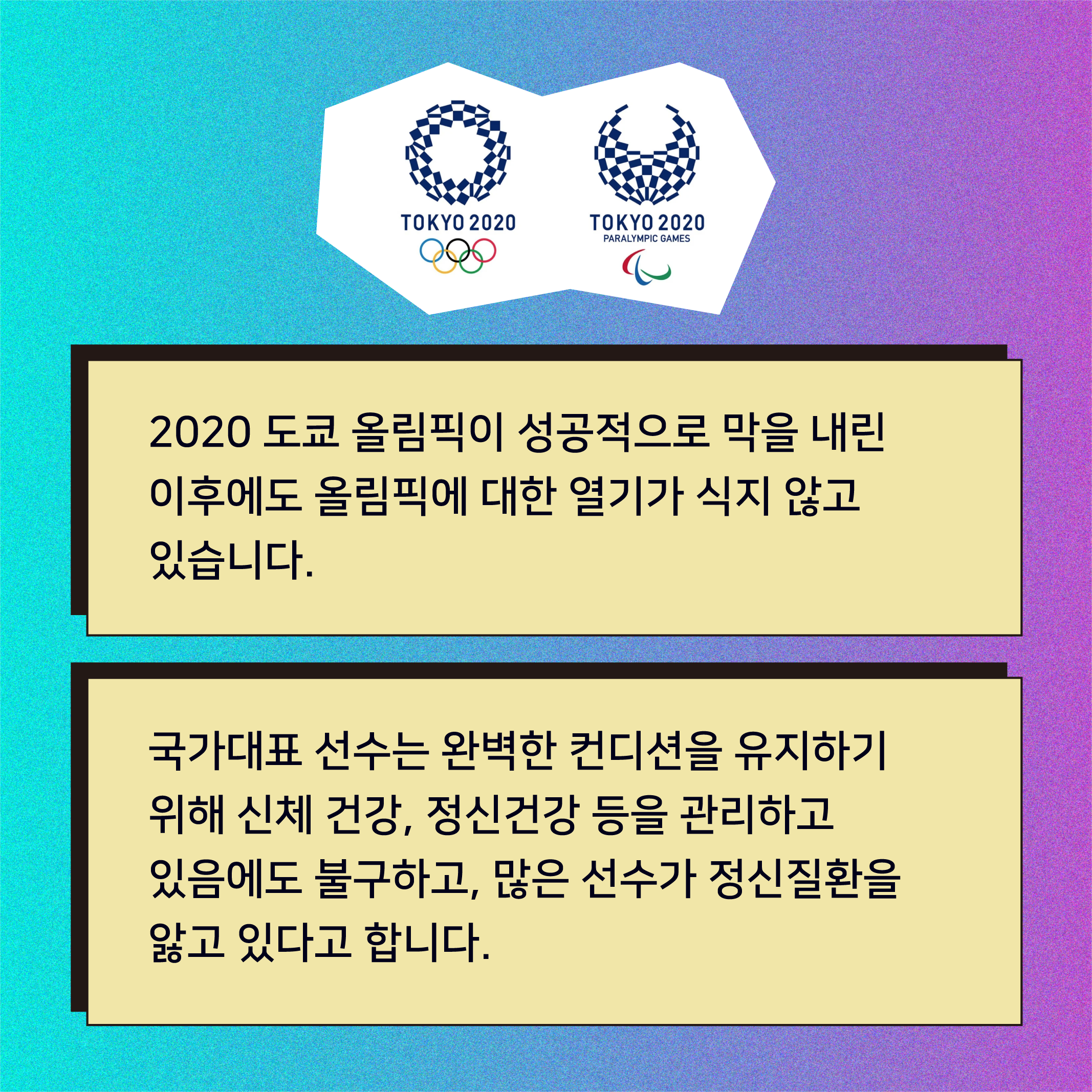 2020 도쿄 올림픽이 성공적으로 막을 내린 이후에도 올림픽에 대한 열기가 식지 않고 있습니다. 국가대표 선수는 완벽한 컨디션을 유지하기 위해 신체 건강, 정신건강 등을 관리하고 있음에도 불구하고, 많은 선수가 정신질환을 앓고 있다고 합니다.