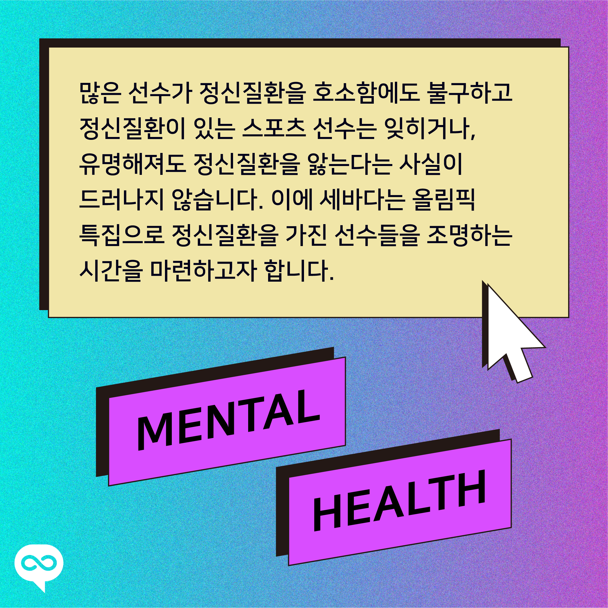 많은 선수가 정신질환을 호소함에도 불구하고 정신질환이 있는 스포츠 선수는 잊히거나, 유명해져도 정신질환을 앓는다는 사실이 드러나지 않습니다. 이에 세바다는 올림픽 특집으로 정신질환을 가진 선수들을 조명하는 시간을 마련하고자 합니다.