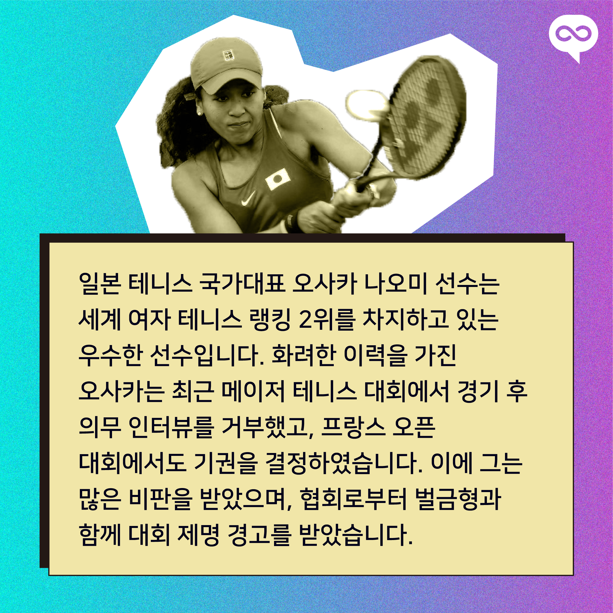 일본 테니스 국가대표 오사카 나오미 선수는 세계 여자 테니스 랭킹 2위를 차지하고 있는 우수한 선수입니다. 화려한 이력을 가진 오사카는 최근 메이저 테니스 대회에서 경기 후 의무 인터뷰를 거부했고, 프랑스 오픈 대회에서도 기권을 결정하였습니다. 이에 그는 많은 비판을 받았으며, 협회로부터 벌금형과 함께 대회 제명 경고를 받았습니다.