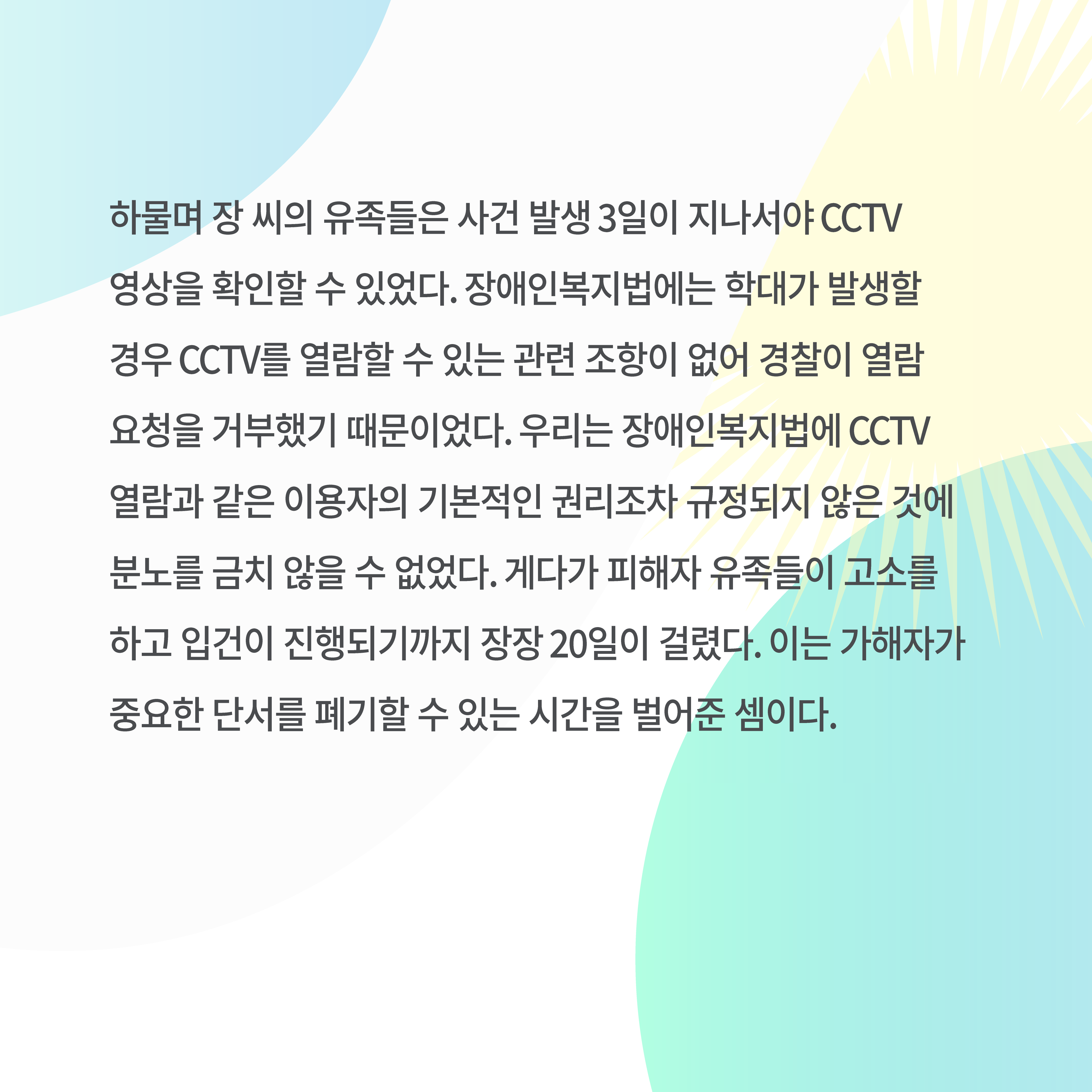 하물며 장 씨의 유족들은 사건 발생 3일이 지나서야 CCTV 영상을 확인할 수 있었다. 장애인복지법에는 학대가 발생할 경우 CCTV를 열람할 수 있는 관련 조항이 없어 경찰이 열람 요청을 거부했기 때문이었다. 우리는 장애인 복지법에 CCTV 열람과 같은 이용자의 기본적인 권리조차 규정되지 않은 것에 분노를 금치 않을 수 없었다. 게다가 피해자 유족들이 고소를 하고 입건이 진해되기까지 장장 20일이 걸렸다. 이는 가해자가 중요한 단서를 폐기할 수 있는 시간을 벌어준 셈이다.