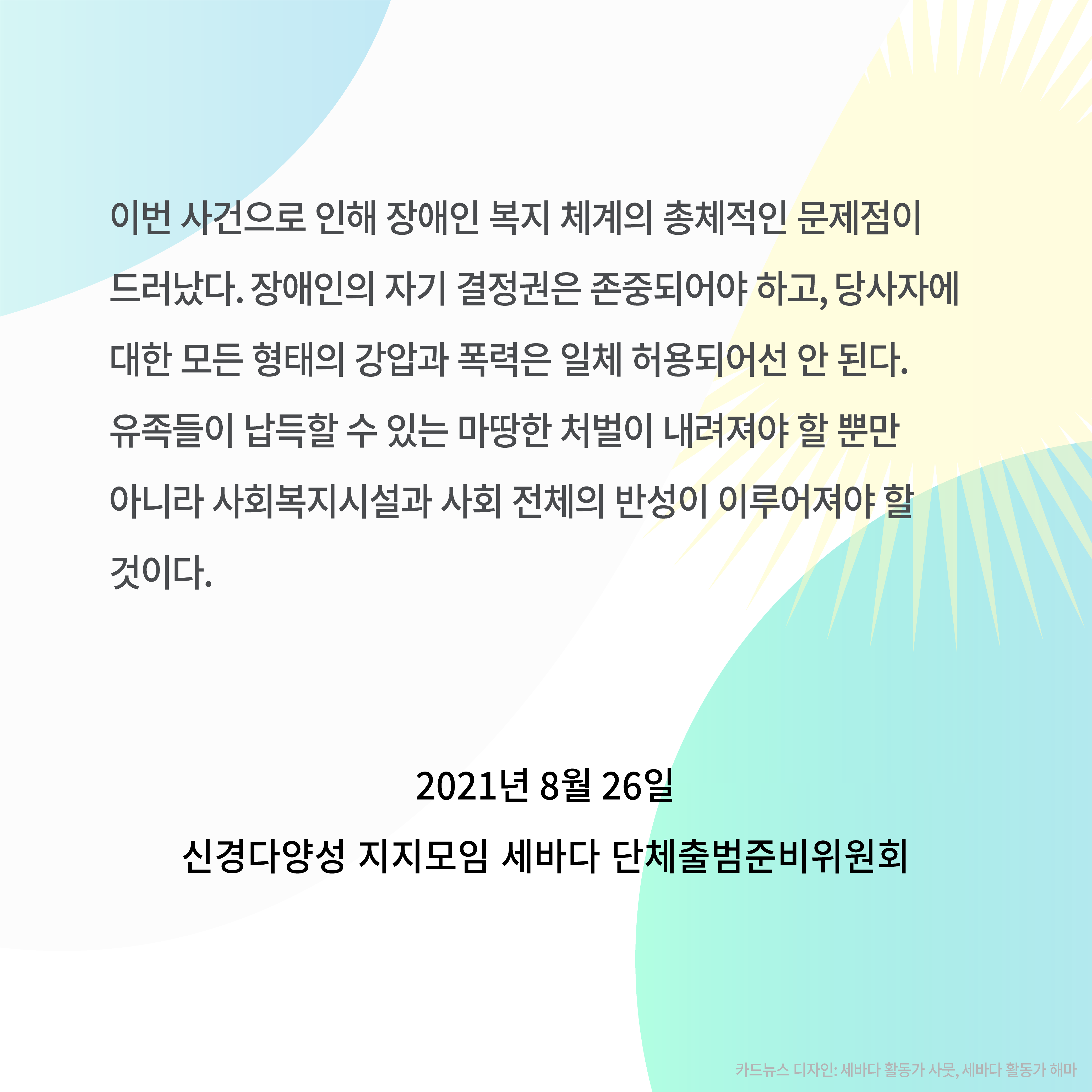 이번 사건으로 인해 장애인 복지 체계의 총체적인 문제점이 드러났다. 장애인의 자기 결정권은 존중되어야 하고, 당사자에 대한 모든 형태의 강압과 폭력은 일체 허용되어선 안 된다. 유족들이 납득할 수 있는 마땅한 처벌이 내려져야 할 뿐만아니라 사회복지시설과 사회 전체의 반성이 이루어져야 할 것이다.