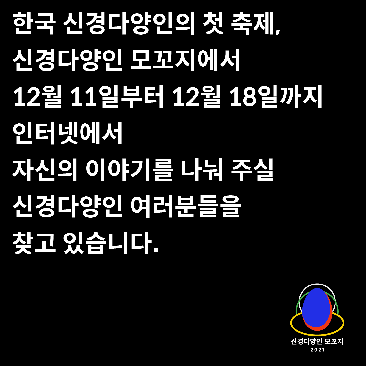 한국 신경다양인의 첫 축제, 신경다양인 모꼬지에서 12월 11일부터 12월 18일까지 인터넷에서 자신의 이야기를 나눠 주실 신경다양인 여러분들을 찾고 있습니다.