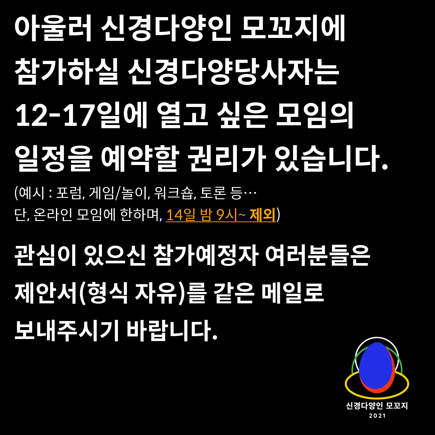 아울러 신경다양인 모꼬지에 참가하실 신경다양당사자는 12-17일에 열고 싶은 모임의 일정을 예약할 권리가 있습니다.