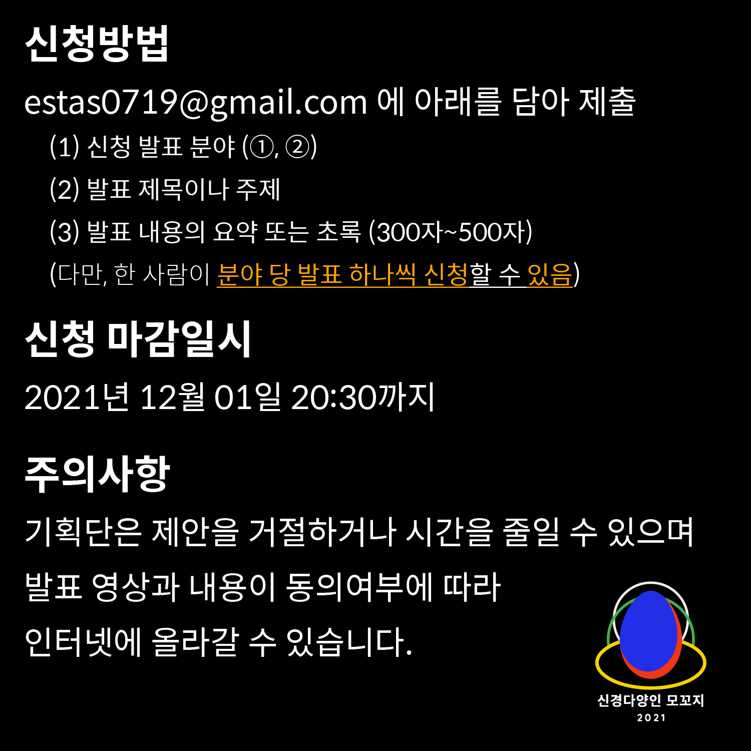 (다만, 한 사람이 분야 당 발표 하나씩 신청할 수 있음)