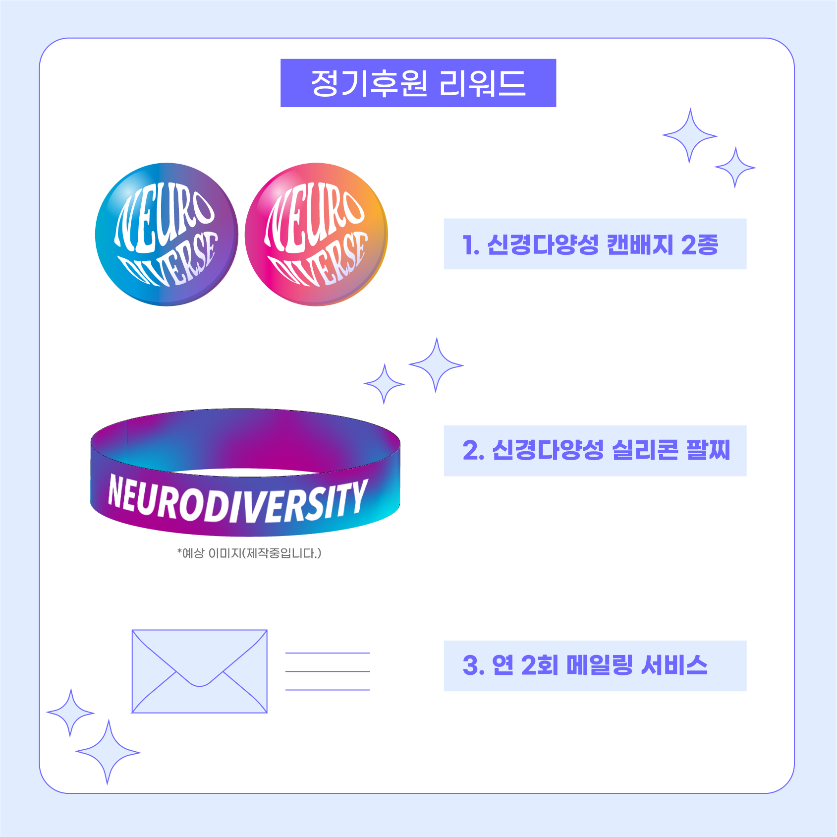 정기후원: 배지 2종, 실리콘 팔찌 1개, 연 2회 메일링 서비스, 감사편지